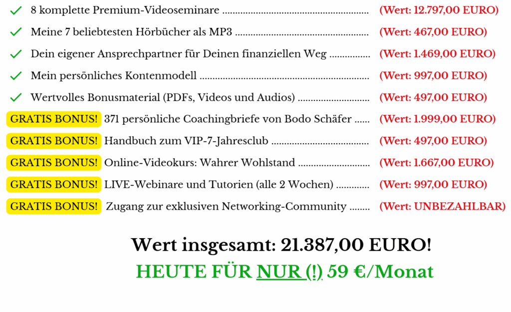 Es liegt mir am Herzen, dass Du HEUTE den ersten Schritt in die Richtung Deiner 1. Million machst. Indem Du dieses unwiderstehliche Angebot annimmst. Deshalb habe ich es gewählt, dass es sich jeder – wirklich JEDER – erlauben kann: 59 €
